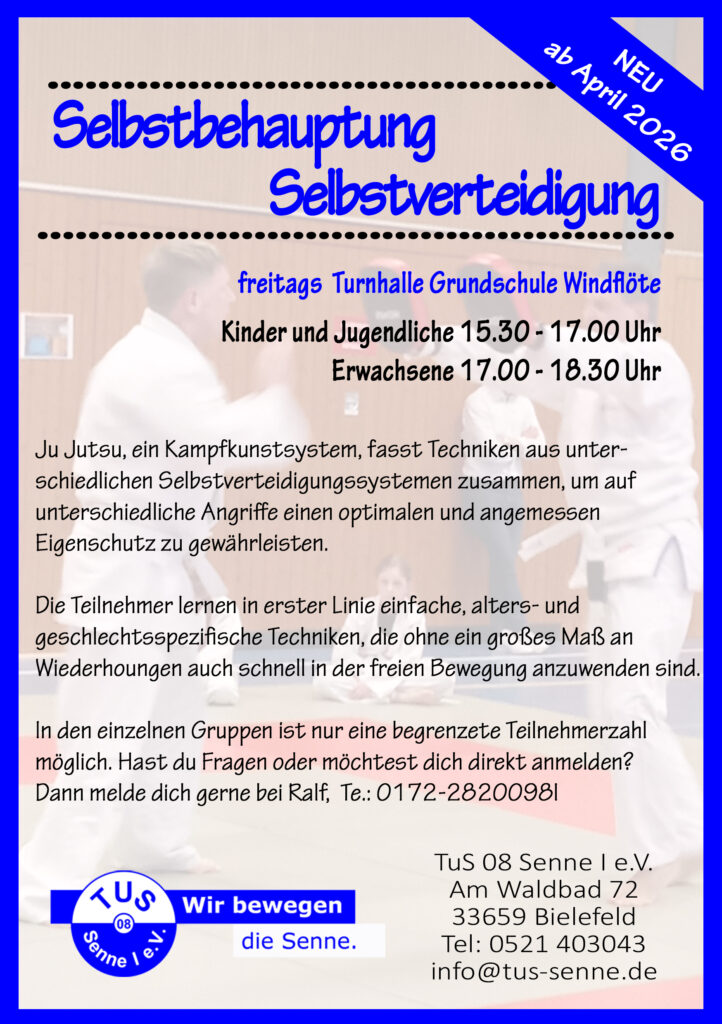 | Ju-Jutsu | FR 17:00 – 18:30 | Grundschule Windflöte | Ralf Köpper | 0172-2820098 rkoepper@web.de |
